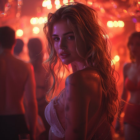 A young woman stands in a nightclub, illuminated by colorful lights. The vibrant atmosphere is filled with energy, joy, and the excitement of nightlife.