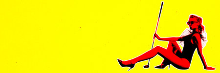 Elegant young woman in bodysuit and heels sitting with golf club against bright yellow background. Contemporary art collage.