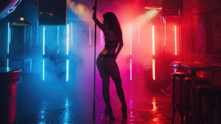 Dancer Silhouette Illuminated by Neon Lights in Vivid Colors, Dynamic Nightlife Scene