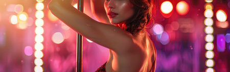 Young sexy woman pole dancing striptease with pylon in night club. Beautiful stripper girl on stage.
