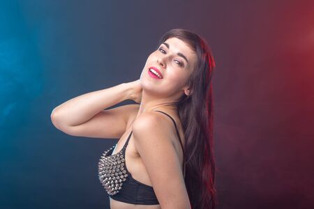 Attractive young sexy brunette woman in riveted top posing in the studio on a dark background. Concept of well-groomed young woman.