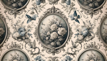 A French Toile de Jouy vintage cameos with flowers birds butterflies, Ai generated image