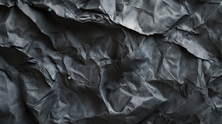 Black crumpled paper texture. Blank dark background with creases. Generative AI.