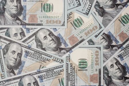 Close up of 100 dollar bills as a background. Amarican dollars pattern. Top view of business concept.