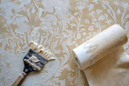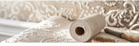 Roll of elegant wallpaper with an intricately designed pattern alongside painting tools in a stylish home environment.