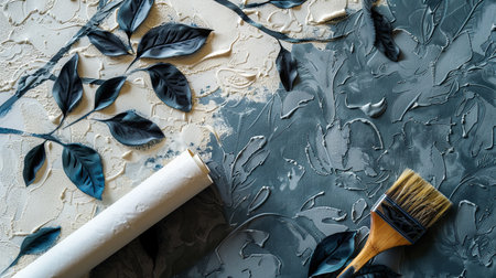 A painter uses a brush to apply textured paint on a wall, complemented by decorative leaves for a unique artistic touch.