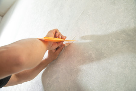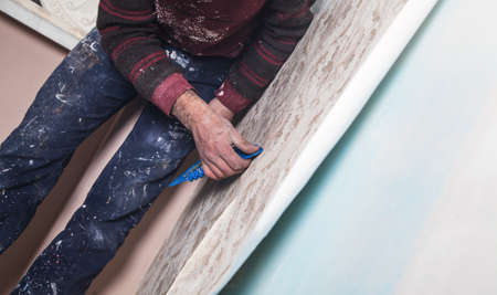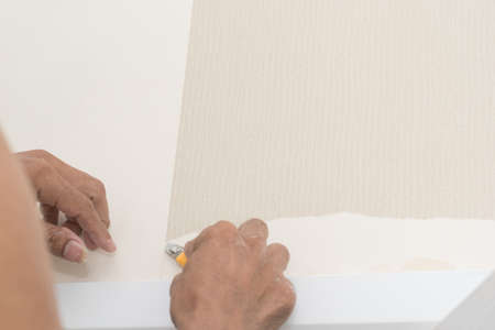 closeup male hands preparing new bended wallpaper roll with stationery knife on table indoor. Cutting preparation in repair apartment. renovation, design concept