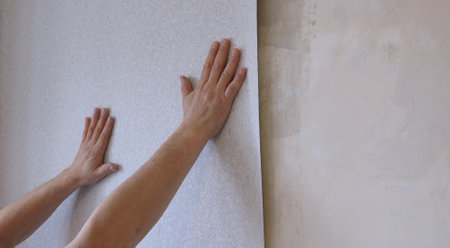 hands smoothing a strip of light non-woven wallpaper on the wall, manually leveling the wallpaper when updating the interior of a room, repairing on our own
