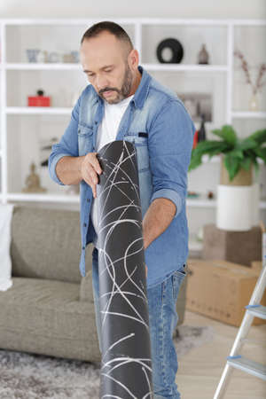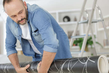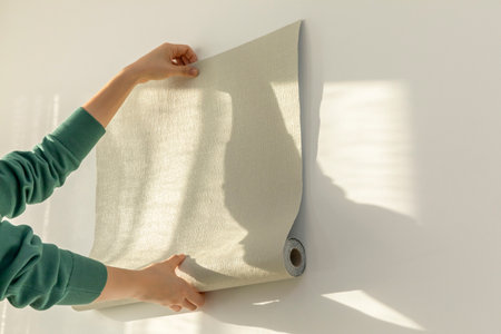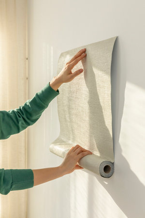 Man unraveling a rolled white wallpaper, illustrating home renovation and interior design in process AI