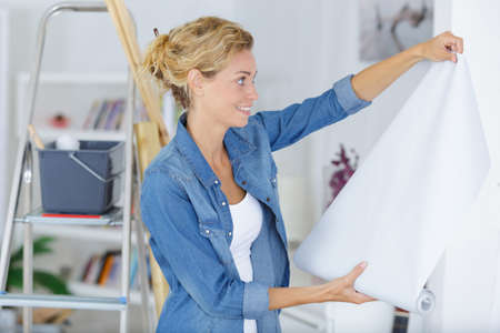 Portrait of a woman trying on rolls of Wallpaper to the wall. Wallpapering on the wall.