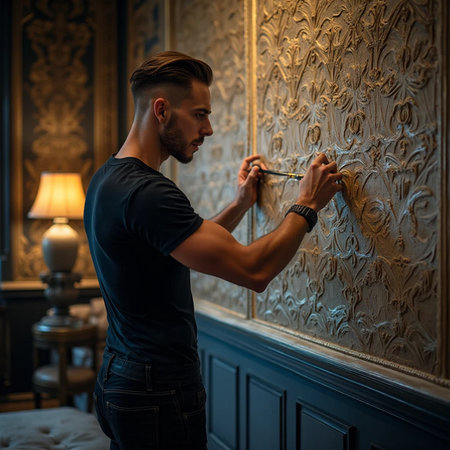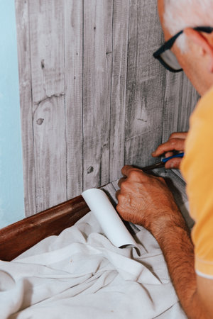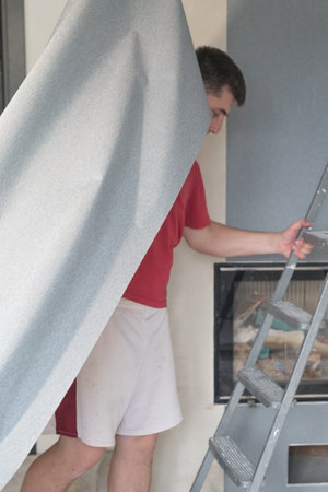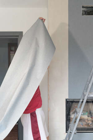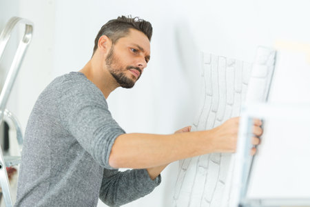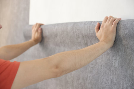closeup of a caucasian man, wearing a gray working coat, attaching a piece of a floral patterned wallpaper to a white wall, in a panoramic format
