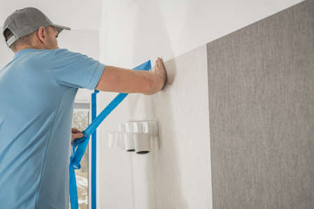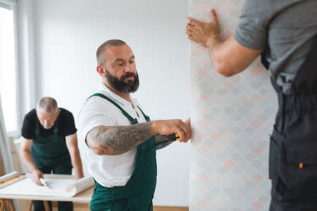 Caucasian Worker in His 40s Applying Vinyl Wallpaper on the Apartment Wall. Industrial Theme.
