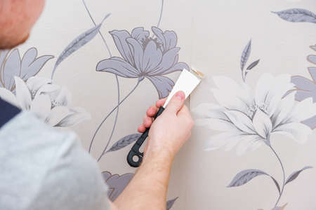 Repair the apartment. Worker glues the wallpaper to the wall.