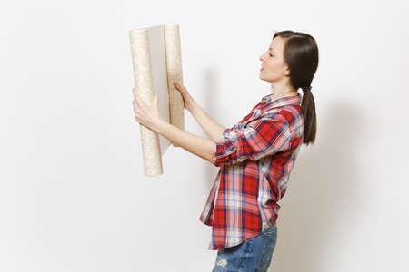 Young serious beautiful woman in casual clothes looking on unrolled wallpaper roll isolated on white background. Instruments, accessories, tools for renovation apartment room. Repair home concept