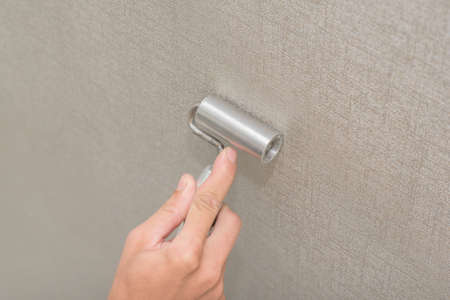 Hand holds a roller for painting the walls. Soft roller for wallpapering and textured application