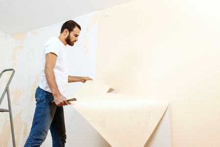 Caucasian Men in His 40s Replacing Old Vinyl Wallpaper Inside His Apartment. Home Improvement Theme.