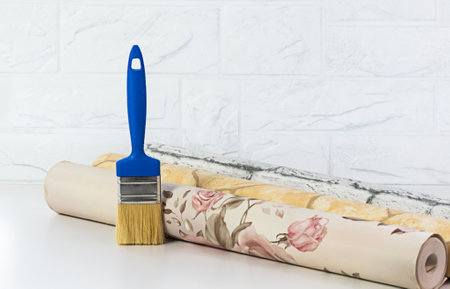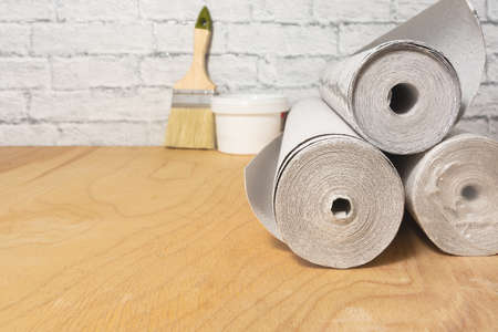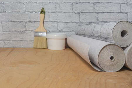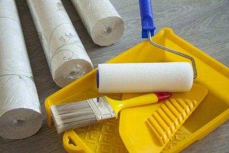 Wallpaper rolls, paintbrush and glue are ready for the room renovation. DIY repair.