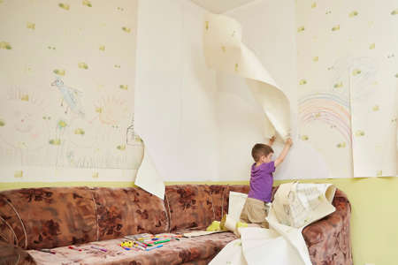 boy helps to make repairs in the room by removing old wallpaper from the walls
