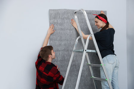 Back view portrait of married couple holding wallpaper to wall while redecorating house, copy space