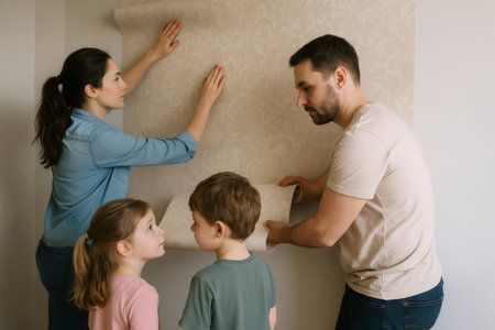 Parents and children hanging wallpaper, working together to improve their home and create a warm family atmosphere