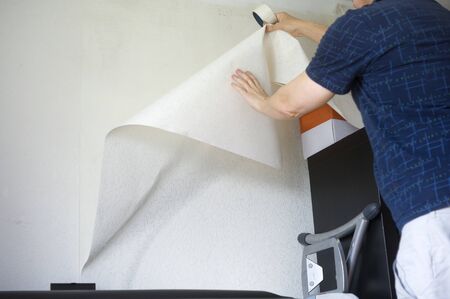a man holding a peeling wallpaper with adhesive tape in a hand