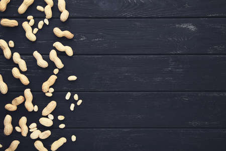 Peanuts in a shell. Organic raw groundnut. Black background. Top view.
