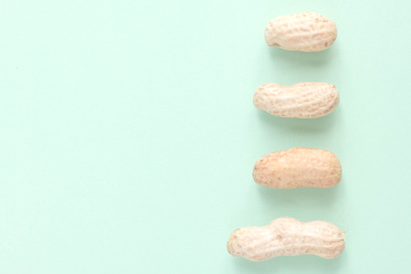 Beautiful colorful unpeeled peanut pattern on a light blue background. Flat lay arrangement, top view.