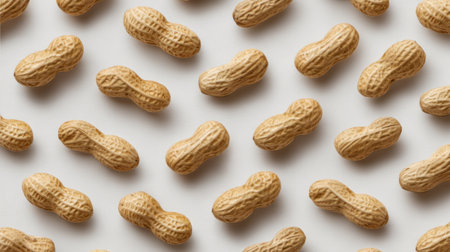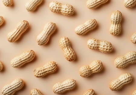Raw peanuts arranged in a uniform pattern on a soft beige background, showcasing their textured shells and natural colors. Perfect for food and snack concepts.
