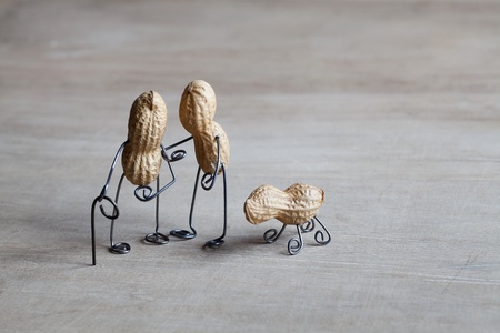 Peanut Fight. One Peanut holding hammer after crushing other peanut in spot light
