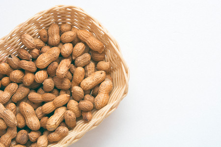 Peanut in the basket on white background made up of salted peanuts in their shells