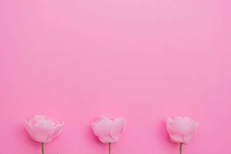 Three roses of pastel colors on a pink background are located below. Copy space. Flat lay.