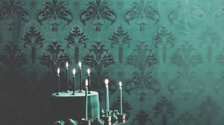 A birthday cake with glowing candles on a table in front of a wall.
