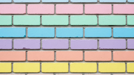Rainbow colored brick texture closeup horizontal background.