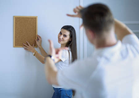 Woman helps her partner to hang painting on wall of their new house, she is framing the photo with her fingers