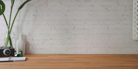 Cropped shot of comfortable workplace with camera and office supplies on wooden table and brick wall background
