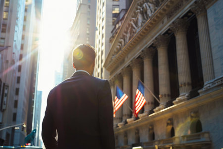 An impressive stock market building in New York City at sunset showcasing a dark white and bronze facade in the style of classical architecture complemented by the iconic Wall Street bull market and the surrounding buildings with a clock tower in the heart of downtown Manhattan captured in stunning 8k detail