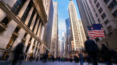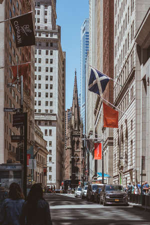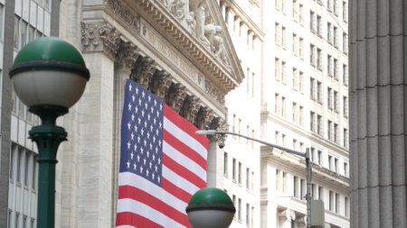 New York City, United States. Lower Manhattan Downtown Financial District urban architecture exterior. American flag. Wall street Stock Exchange building facade columns, USA Stock Market trading, NYC.
