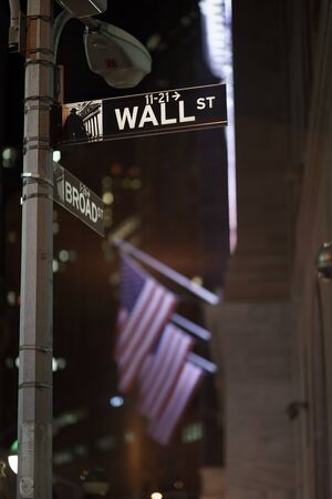 Broadway and Wall Street Signs at the night with US flags on background, Manhattan, New York