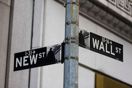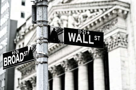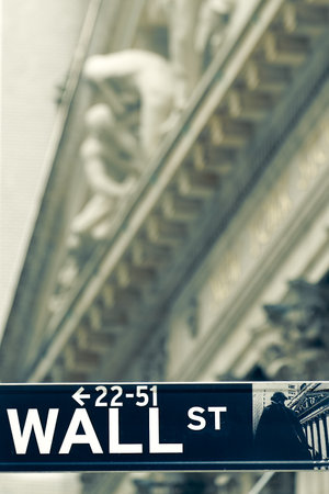 New York City, Wall Street Road Sign, Stock market building behind. High quality photo