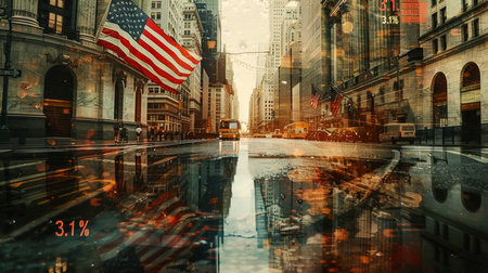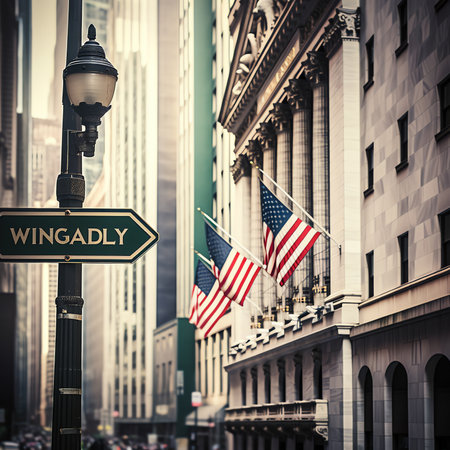 Generative AI : Wall street sign with focus on sign blurred American flag background
