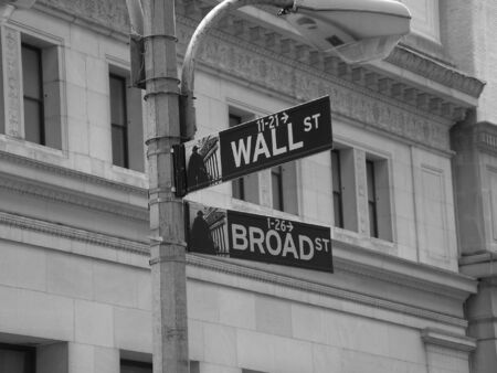 wall street and broadway cross in New York city. street indication boards. wall street is the maining and most important financial area of the city