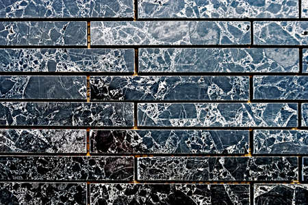 A textured wall featuring rectangular tiles in a mosaic of various blue and white shades, creating a harmonious and classic pattern.