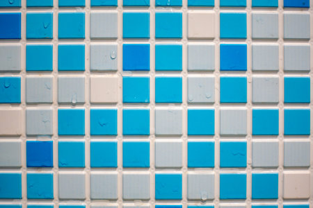 A blue and white tile wall with water droplets on it. The tiles are square and blue and white