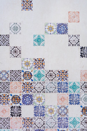 Texture background from mosaic old ceramic tiles. Colorful facade decoration.