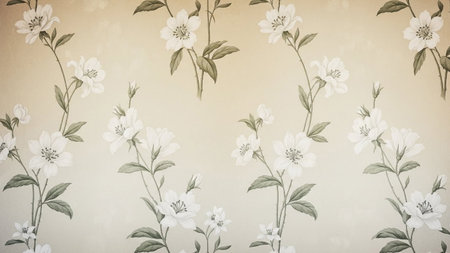 A delicate vintage floral wallpaper featuring white blossoms and green leaves on a soft cream background.