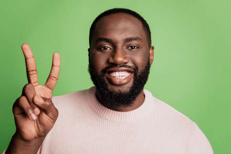 Photo of friendly positive cheerful handsome man raise hand show v-sign wear white shirt over green background