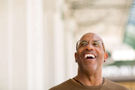 Minimal portrait of smiling senior man lit by sunlight against white wall and smiling, copy space