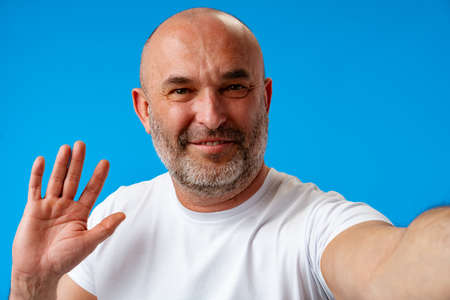 Middle age man wearing casual t-shirt standing over isolated blue background waiving saying hello