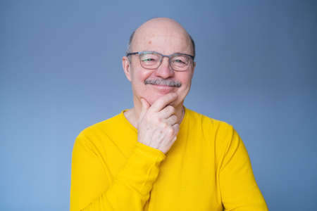 Close-up portarit of senior grey-haired man isolated over light blue background.