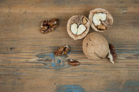 Walnut scattered on the wooden vintage table. Walnuts is a healthy vegetarian protein nutritious food. Walnut on rustic old wood.